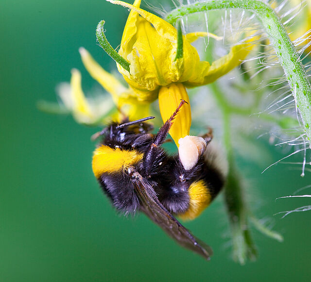 수분 중에, 서양뒤영벌(나투벌)은 꽃을 물어 꽃이 진동하도록 만듭니다. 이를 진동수분이라고 부릅니다. 서양뒤영벌(나투벌) 턱이 꽃에 각인된 흔적(바이트 마크)은 1~4시간 내에 갈색으로 변하며 이를 통해 서양뒤영벌(나투벌)의 작업을 확인할 수 있습니다. 한 번의 접촉만으로도 수분을 위한 충분한 꽃가루가 전달됩니다. 열매는 꽃의 수분이 완료되면 맺힙니다.