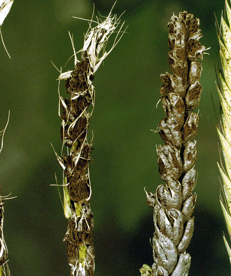 Ustilago nuda f.sp. tritici 감염은 잎이 나타날 때까지 보이지 않습니다. 감염의 첫 번째 징후는 이삭에 얼룩이 생기는 것입니다. 일반 조직 대신, 이삭에 올리브빛 갈색 얼룩의 포자가 다량 포함되어 있습니다.