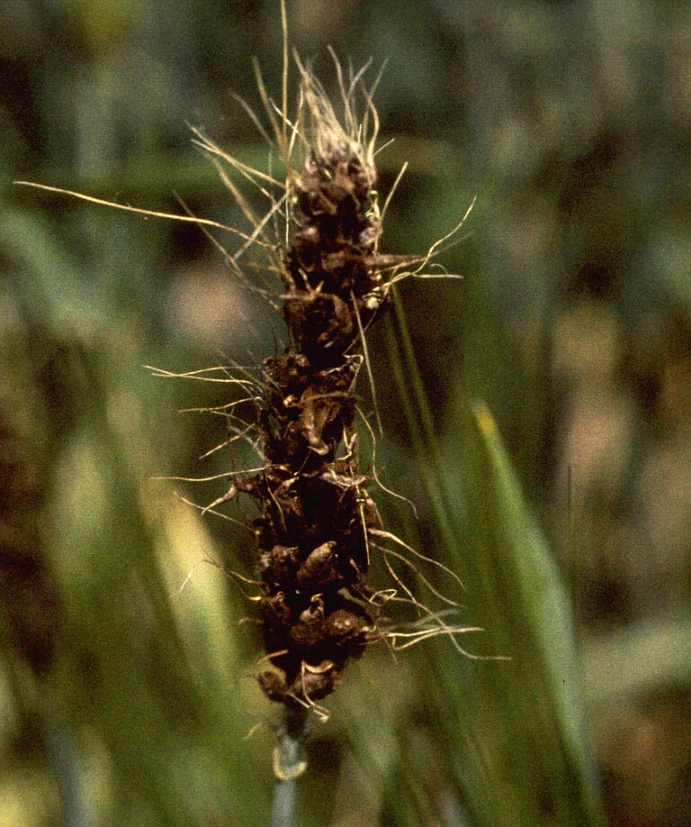 종자는 개화기 동안 감염되며 감염된 종자는 다음 재배시 일차 접종원으로 작용합니다. 이 균류는 종자 내부에 남아 종자가 발아하면 균류의 균사체가 식물 내부에서 위로 자라면서 생장점과 종자 시원체(primordia)로 자라 들어갑니다. 잎이 나타난 후에만 육안으로 확인됩니다. 전신에 감염된 종자에서 형성된 유주자는 인근의 다른 종자를 감염시킵니다. 이들은 하루 안에 발아되며 새로 감염된 종자의 내부 조직을 감염시킵니다. 종자가 성숙되는 동안, 균사체의 벽은 두꺼워지고 휴면 내구체로 부풀어 오릅니다.