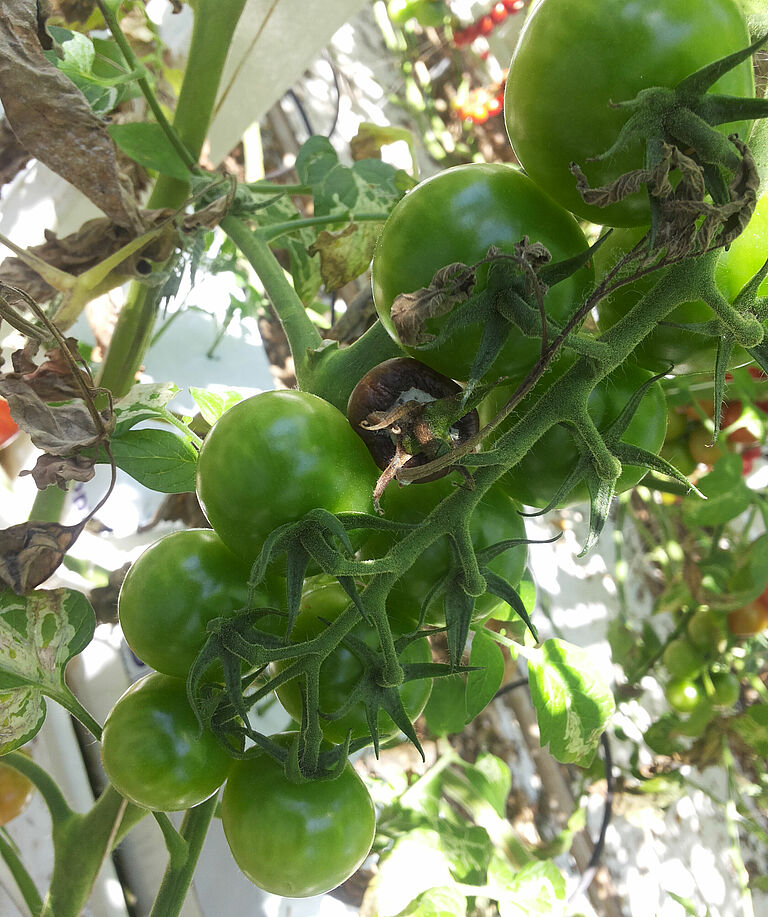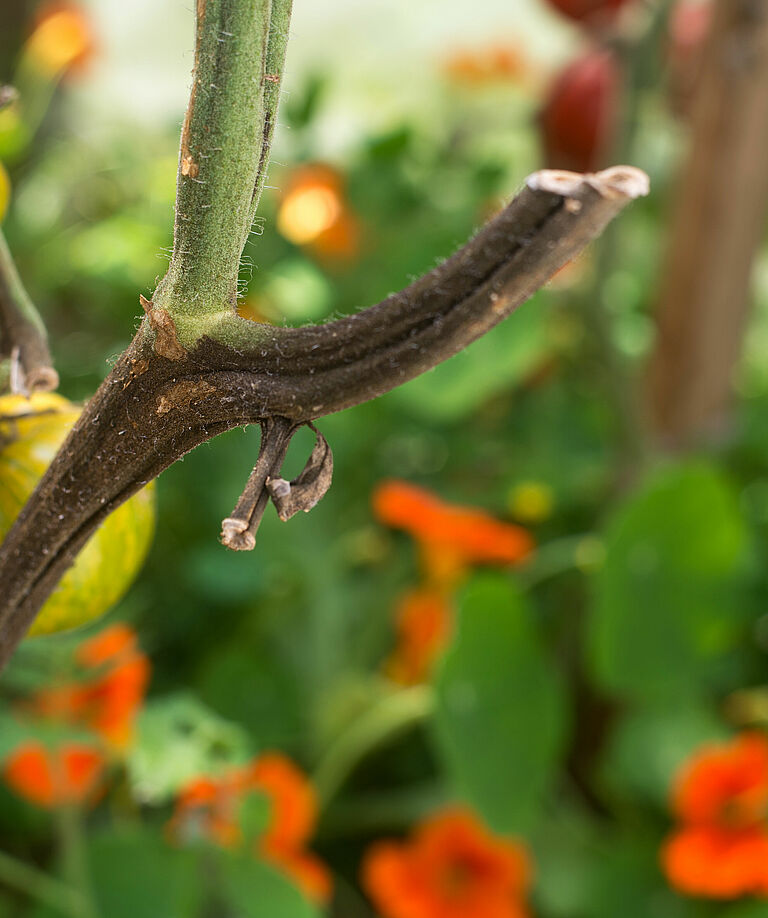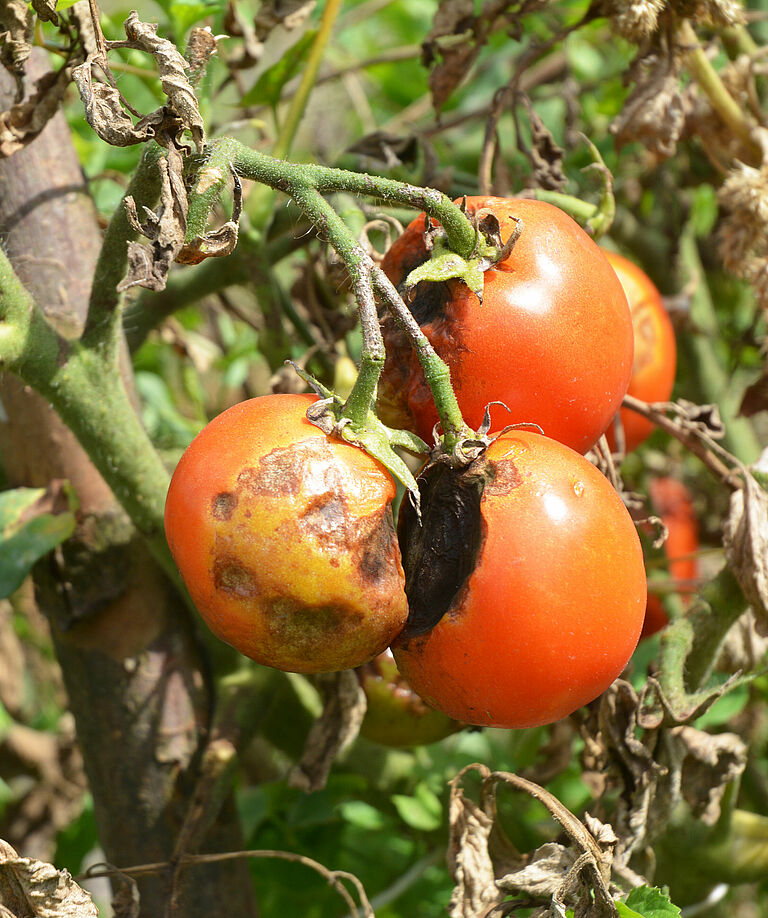 Phytophthora는 난포자(월동 유성포자), 포자낭(직접 발아할 수도 있고 유주자를 생산할 수 있는 특수 구조), 후막포자(건조한 기후를 견딜 수 있는 벽이 두꺼운 균사체) 또는 균사체 등 다양한 상태로에서 뿌리, 감염된 덩이줄기, 구근 또는 토양에서 월동합니다. 유주자(zoospores)는 숙주를 감염시키는 월동 구조에서 형성됩니다. 유주자는 편모가 있는 포자로 이를 사용하여 물을 통해 이동할 수 있습니다. 감염은 보통 뿌리에서 시작하여 밑둥으로 발생하는데 밑둥에 직접 감염되기도 합니다. 자라나는 뿌리 끝에서 분비하는 삼출물이 발아를 촉진하고 유주자를 끌어들입니다. 이 병원균은 줄기 및 식물 표면에서 자라며, 기공을 통해 나온 포자낭을 가진 새로운 포자낭병(포자의 일종인 포자낭을 포함하는 구조)이 형성됩니다. 2차 감염은 포자 발아를 통해 일어날 수도 있고 포자낭에서 생성된 유주자에 의해 일어날 수도 있습니다. 식물의 지상 부분에서의 발아에는 잎의 수분이 필요합니다.