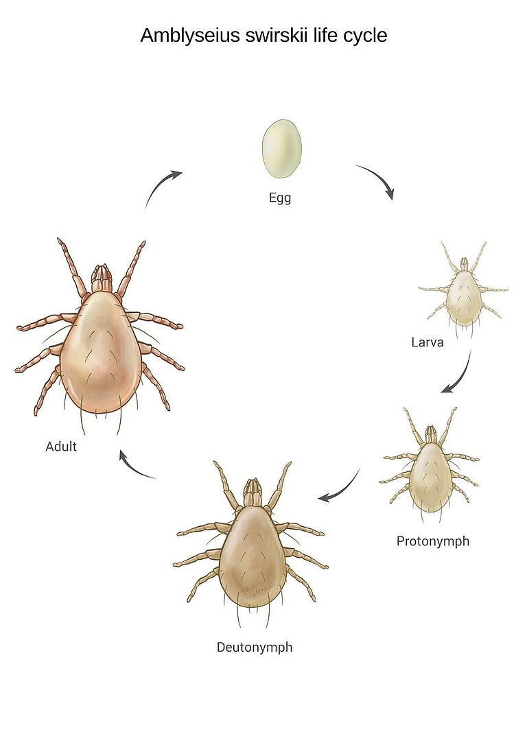 포식성 진드기의 수명 주기는 알, 유충, 원충, 성충, 성충의 5가지 발달 단계로 구성됩니다. 포식성 진드기는 해충이 서식하는 지역 근처에 알을 낳습니다. 유충은 세 쌍의 다리를 가지고 있습니다. 포식성 진드기 종에 따라 유충은 활동적이거나 비활동적입니다. 유충이 탈피하여 원충(다리 4쌍) 단계로 변태하면 즉시 먹이를 먹기 시작합니다. 원충, 중충 및 성충 단계 동안 진드기는 거의 지속적으로 먹이를 먹습니다. 원충과 유충은 성충과 모양이 비슷하지만 크기가 더 작습니다.